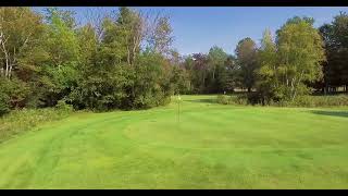 The woods line the left side of the 113 yard hole 5. A small pond sits to the back right of the wide green.